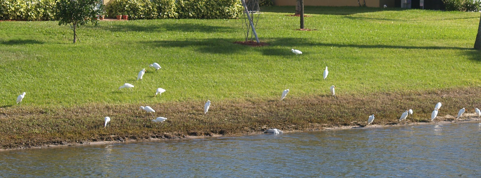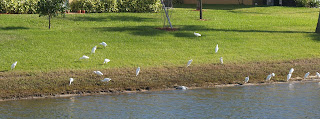 Recently, the lawn service people mowed the fields in our neighborhood. And a white flock quickly flew in for the bug hunt of the day! These white birds dug deeply when rooting around for bugs and such...and they aerate the land at the same time. Multi-tasking Birds! Yippee!